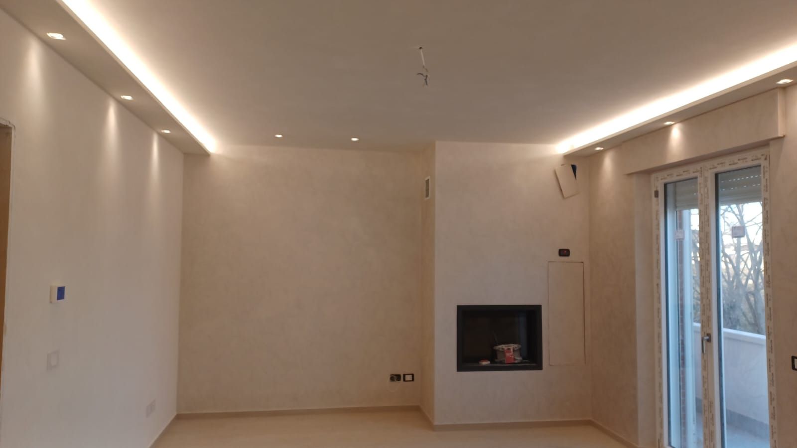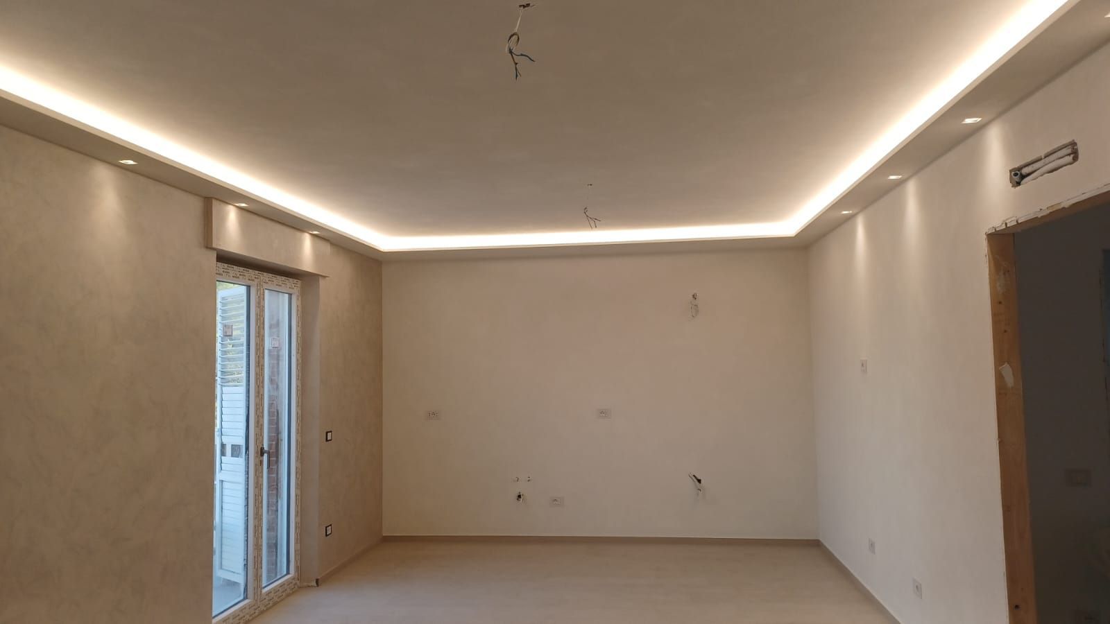 si occupa della realizzazione di controsoffittature anche con impianto di illuminazione, e di lavori in cartongesso in genere, come la posa di muri divisori e penisole per cucine.